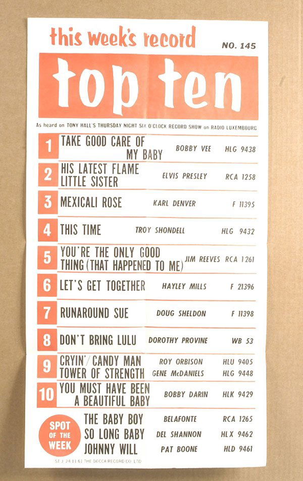 1961 Top Ten Single Chart Poster