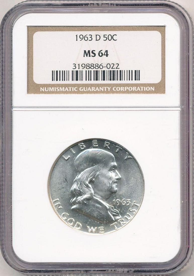 Sold1963-D Franklin Half Dollar NGC MS-641963-D Franklin Half Dollar NGC MS-64 Estimate: $22 Wholesale Bid: $16See Sold Price
