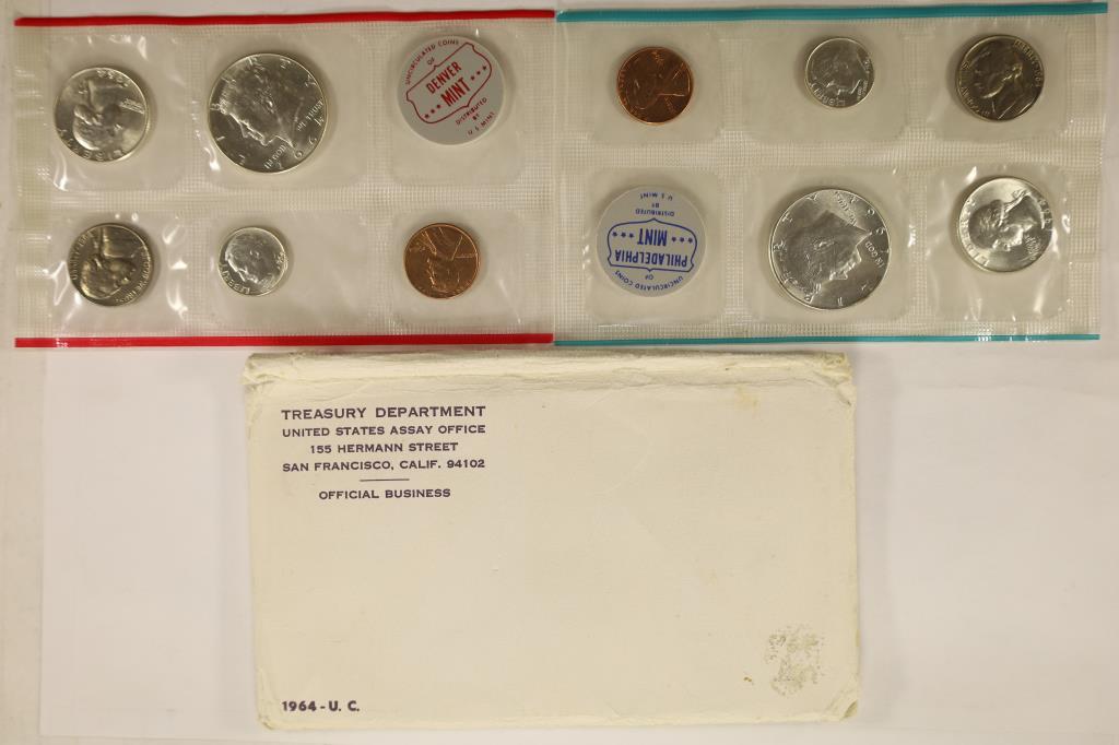 Sold1964 US MINT SET (UNC) P/D (WITH ENVELOPE)2 EACH 90% SILVER HALF DOLLAR, WASHINGTON QUARTERS AND ROOSEVELT DIMESSee Sold Price
