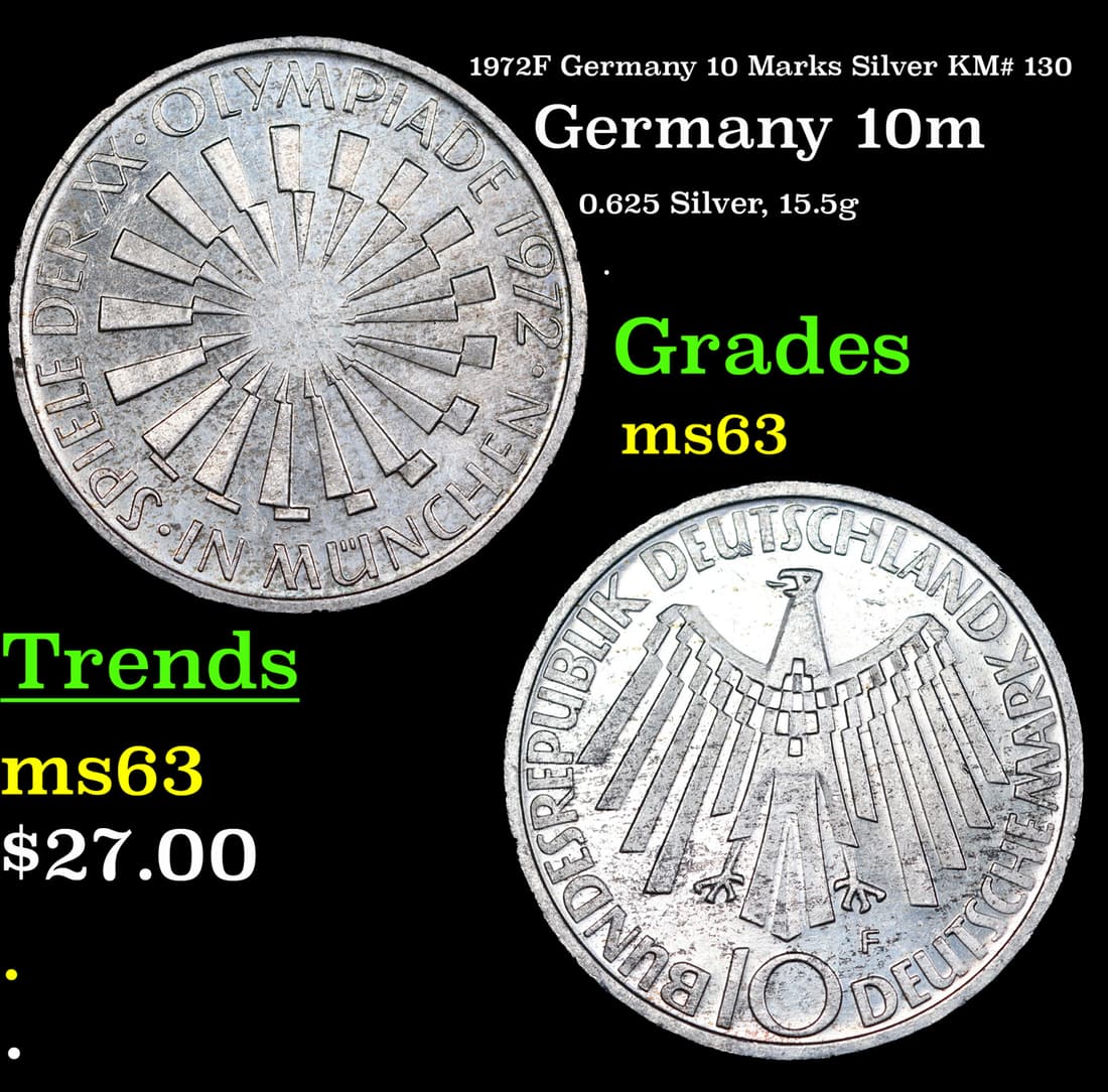 1972F Germany 10 Marks Silver KM# 130 Grades Select Unc