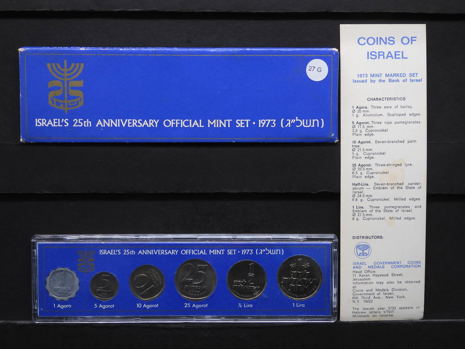 Sold1973 Israel 25th Anniversary Official Mint Set - Uncirculated1973 Israel 25th Anniversary Official Mint Set - Uncirculated. Original Box and COA. 1973 Mint Marked Set - issued by the Bank of Israel. Set including: 1 Agora; 5 Agorot; 10 Agorot; 25 Agorot; Half-LSee Sold Price