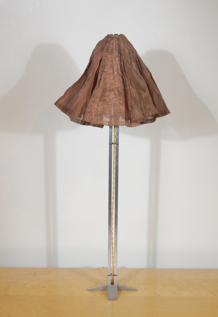 SoldMID-CENTURY MODERN TABLE LAMPGorgeous mid-century modern table lamp with custom made two-tier, two-color 11'' wide shade. Works excellent. Size 26''H 11''W 11''D Condition Very good condition. Working.See Sold Price
