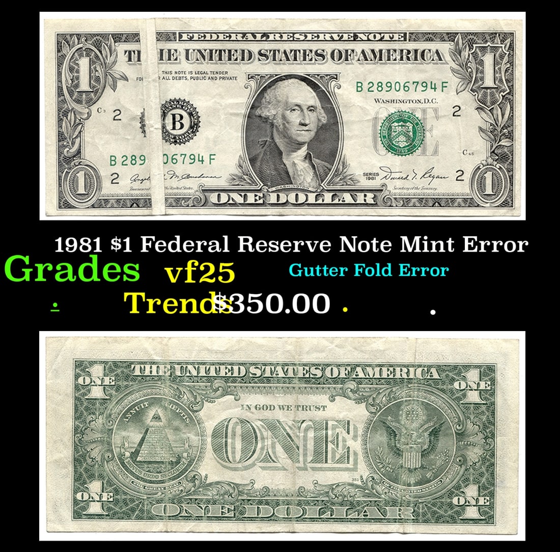 1981 $1 Federal Reserve Note Mint Error Grades vf+
