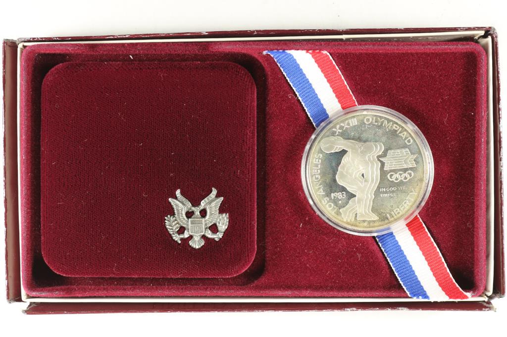 SoldSix US Commemorative Silver Dollar Coin SetsThe first: a 1983 Olympic silver dollar three-coin proof set, within a fitted box and accompanied by certificate of authenticity; the second: a 1983 Olympic silver dollar three-coin proof set, withinSee Sold Price