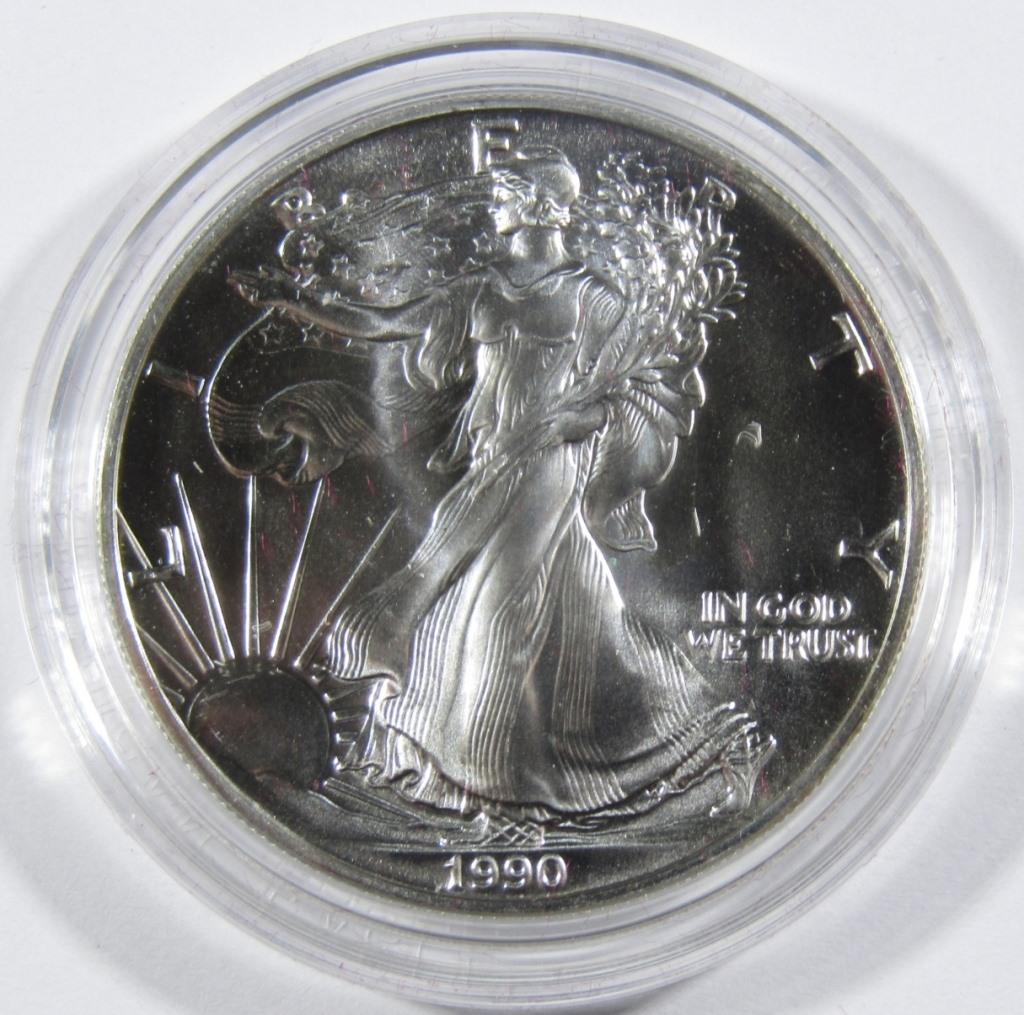 Sold1990 UNC AMERICAN SILVER EAGLE IN OGPWITH GIFT PRESENTATION BOX, VELVET CASE, AND COA.See Sold Price