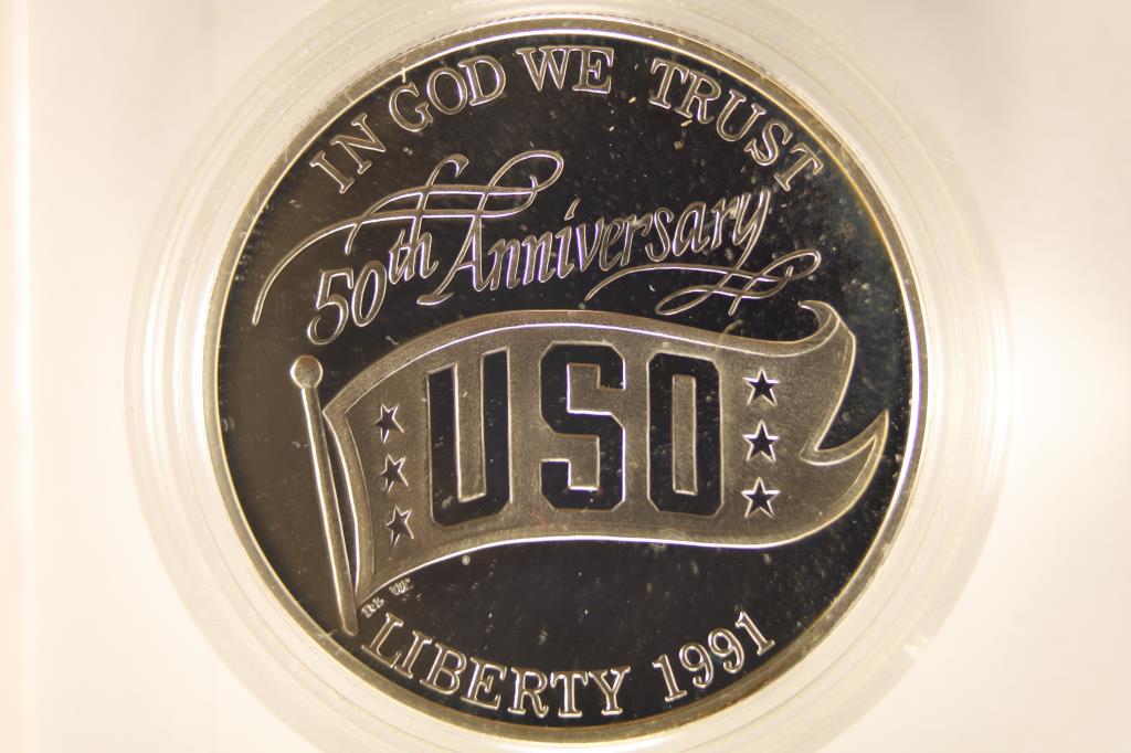 SoldTWO COMMEMS IN ORIG PACKAGE1989 U.S. CONGRESSIONAL COINS 2PCS PROOF SET AND 1991 U.S. USO 50TH ANNIV. PROOF SILVER DOLLAR MISSING COA.See Sold Price