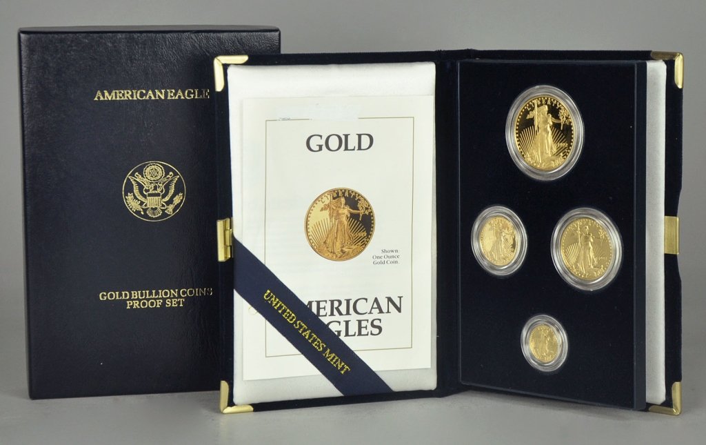 Sold2000 AMERICAN EAGLE 4-COIN GOLD PROOF SET2000 AMERICAN EAGLE 4-COIN GOLD PROOF SET contains four Proof Gold Eagles including one ounce, one-half ounce, one-quarter ounce & one-tenth ounce coins, with original mint packaging, Opening bid $170See Sold Price