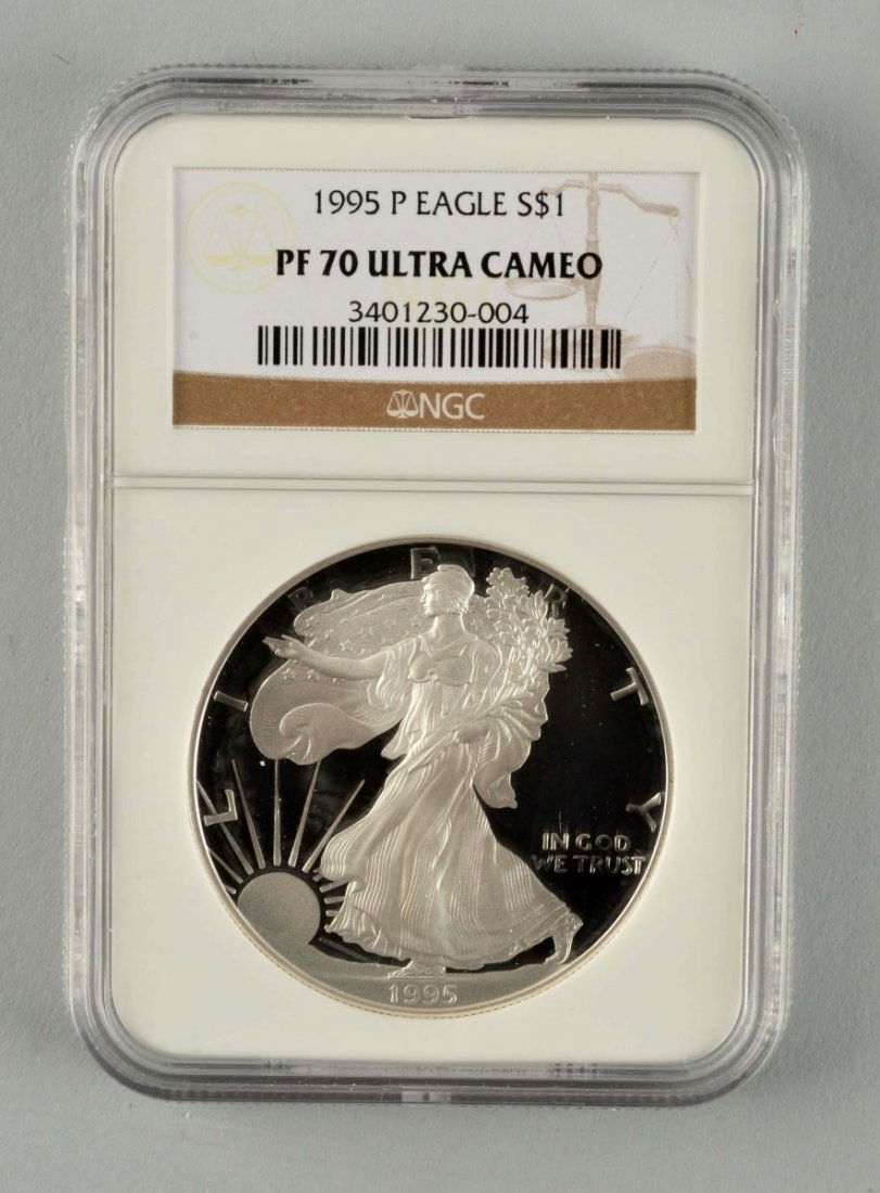 SoldRARE PRROF 1995-P AMERICAN SILVER EAGLERARE PRROF 1995-P AMERICAN SILVER EAGLE OUR GRADE IS PROOF69 WINNER SHALL RECEIVE EXACT COIN SHOWN.See Sold Price