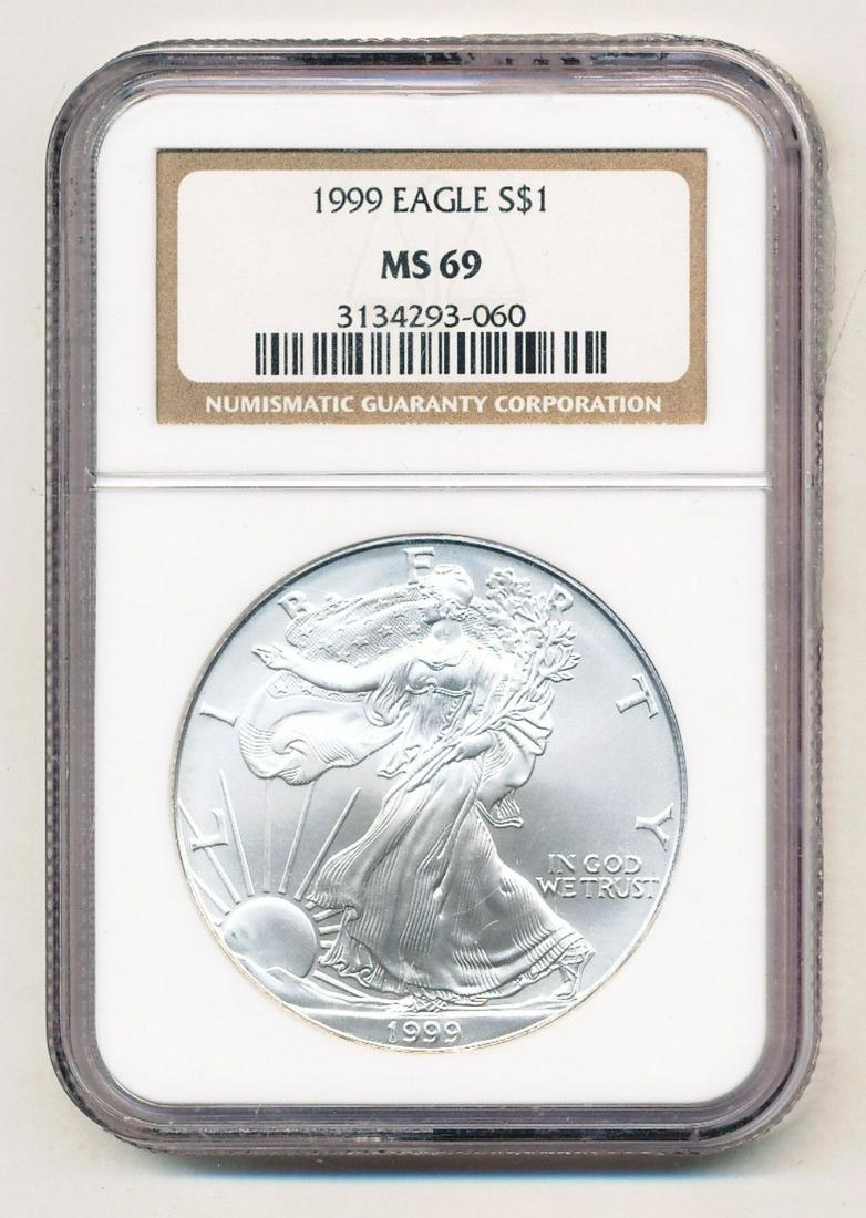 Sold1999 NGC MS69 American Silver Eagle Better Date One Oz.1999 NGC MS69 American Silver Eagle Better Date One Oz. Fine SilverSee Sold Price