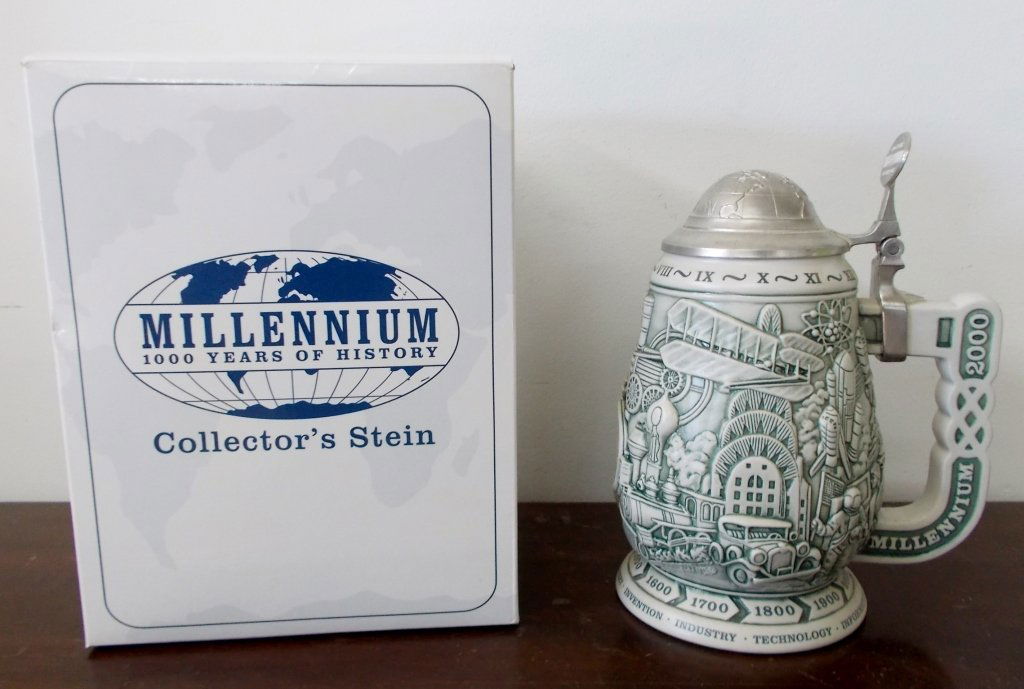 SoldCeramarte Budwieser CS414, Brazilian Beer Stein, Celebrating the Millennium8 1/4" Tall pottery in relief with gold trimmed pewter lid with 30% lead crystal finial, Ltd. Ed. Of 10,000 produced, circa 1999See Sold Price