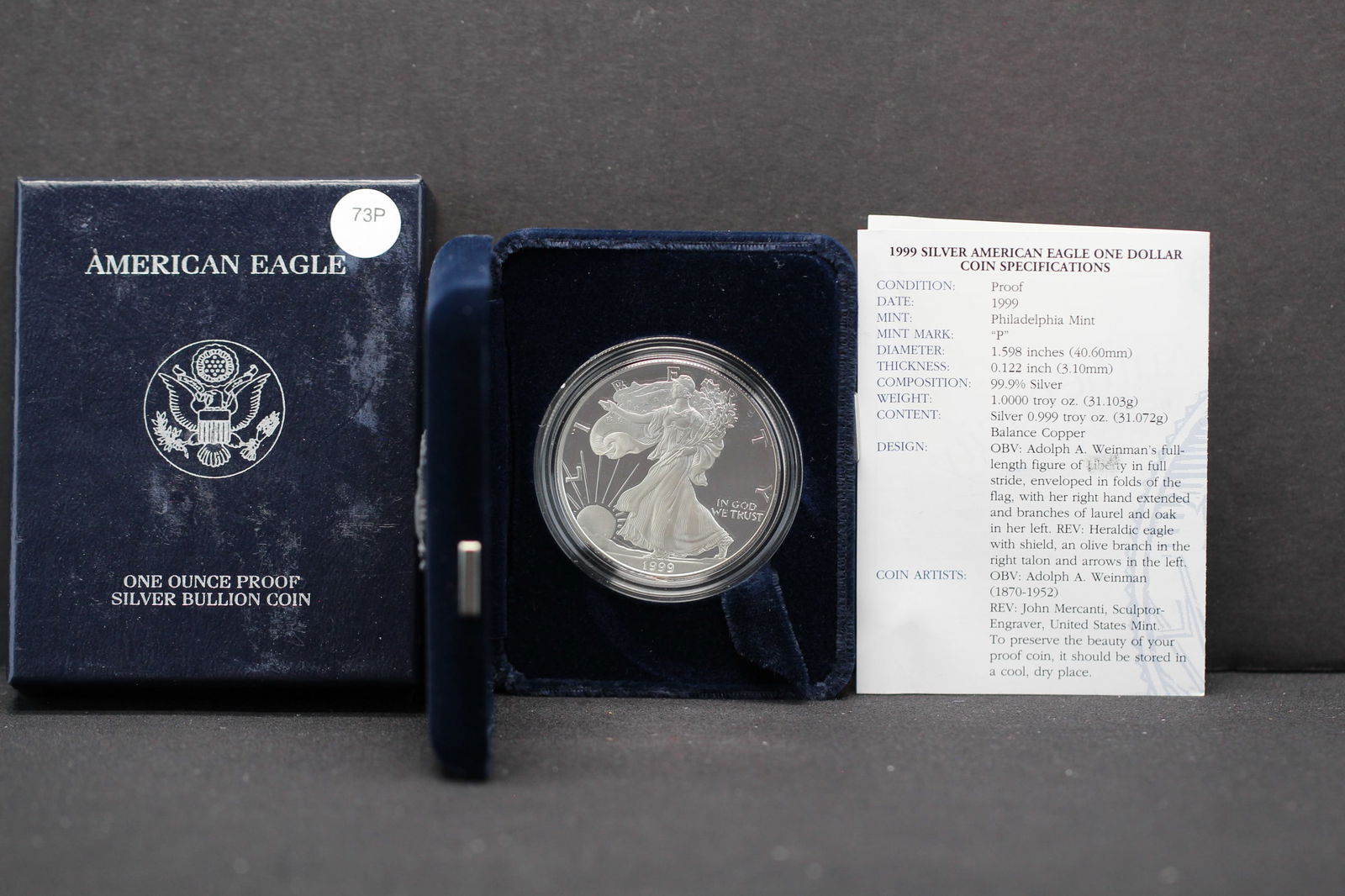 Sold1999 P Silver American Eagle One Ounce Proof CoinEst $60 - 80 1999 P Silver American Eagle One Ounce Proof Coin. One ounce proof silver bullion coin. Comes with original box and COA.See Sold Price