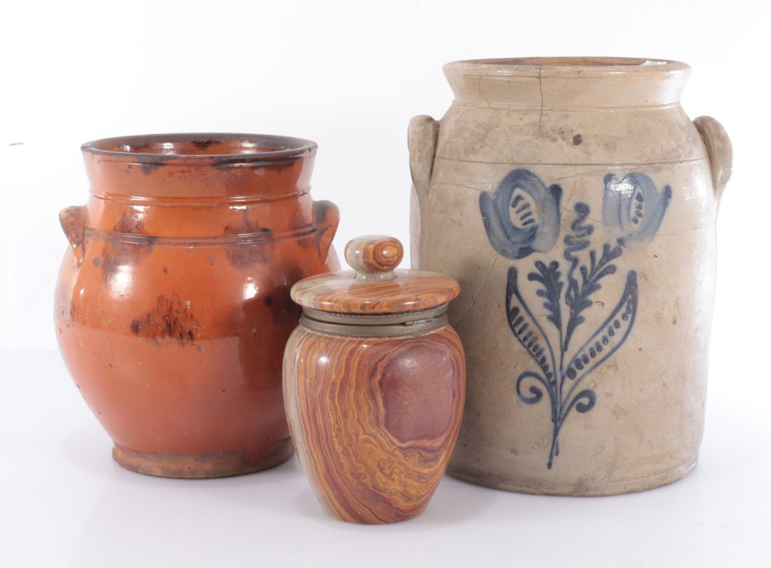 19C Redware Jar, Stoneware Crock; Agate Jar