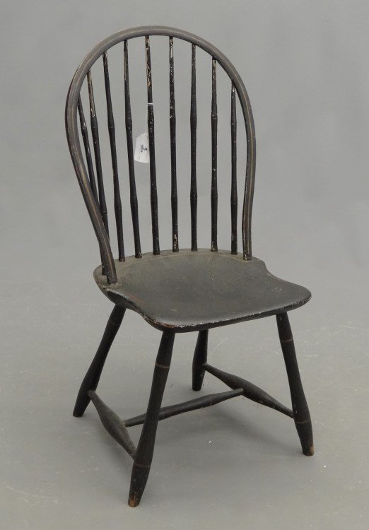 Soldearly 19thC New England bow back Windsor side chair wearly 19thC New England bow back Windsor side chair w shaped saddle seat in old black paint - 36" tallSee Sold Price