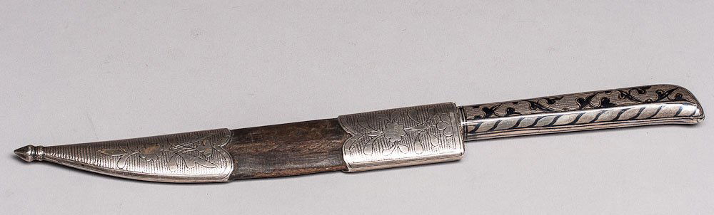 Sold19th C. Russian Silver Dagger KindjalScabbard is heavily covered with silver, leather inserted in fitting. Wooden hilt. Overall length is 20.25" (51.4cm), with 13.25" (33.7cm) double edged sharp spear point blade made of steel. ScabbardSee Sold Price