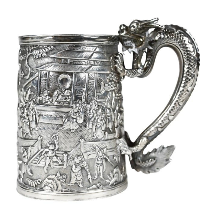 19th C Chinese Export Silver Can w Dragon Handle