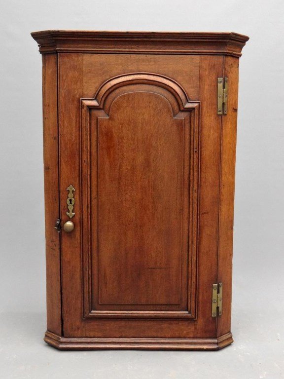 19TH C. GEORGIAN OAK HANGING CORNER CUPBOARD.