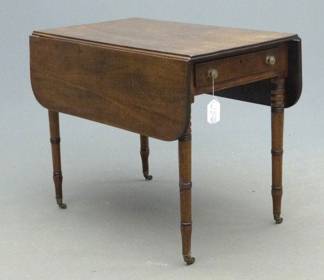 SoldGeorgian Inlaid Mahogany Pembroke TableGeorgian Inlaid Mahogany Pembroke Table , 19th c. and later, banded drop-leaf top, single drawer, tapered legs, caps, casters , h. 26 3/4 in., w. (closed) 19 3/4 in., w. (open) 39 in., d. 32 3/4 inSee Sold Price