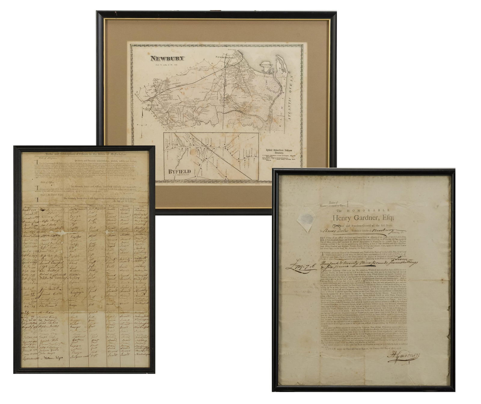 19TH C. MA EPHEMERA, NEWBURY MAP & EARLY DOCUMENTS.