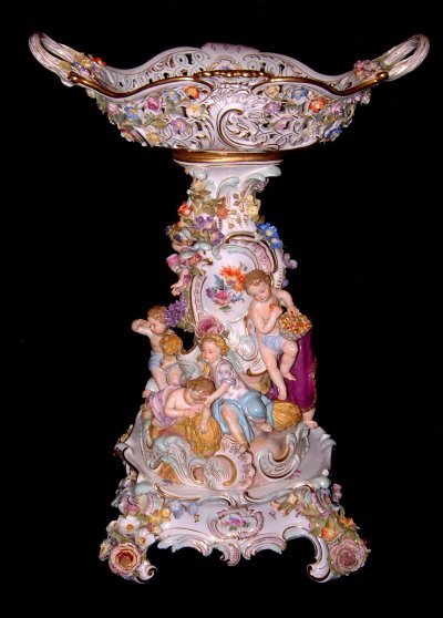 SoldLate 19th C. Meissen Hand Painted Porcelain CompoteMonumental Late 19th Century Meissen Hand Painted Figural Porcelain Compote. Depicting a couple circling a tree encrusted with flowers, pierced top. Very well detailed! Measures - 22 1/4" high x 13 1/See Sold Price