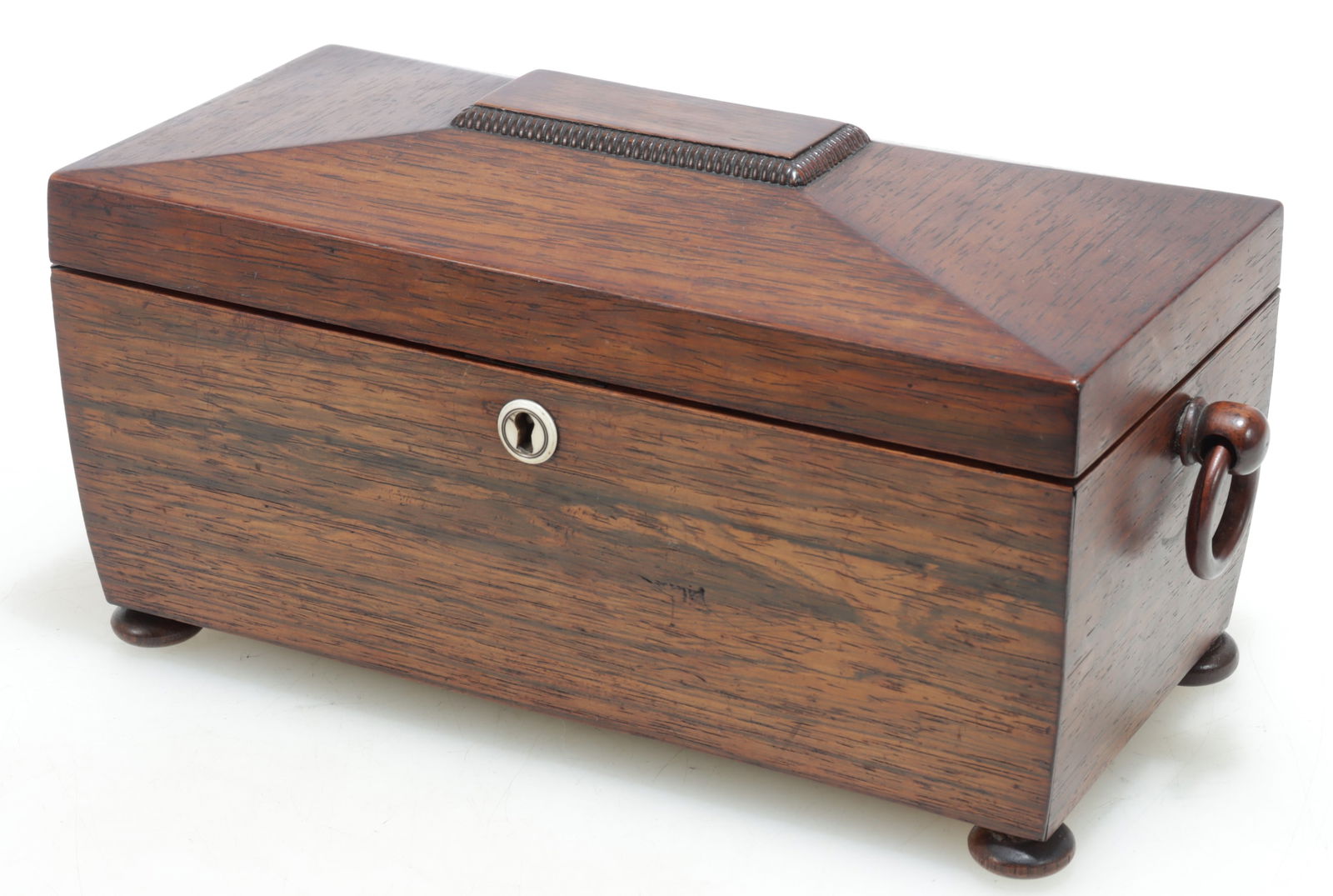 SoldENGLISH REGENCY PERIOD ROSEWOOD SARCOPHAGUS-FORM TEA CADDYEnglish Regency rosewood sarcophagus-form tea caddy, early 19th c., hinged top, opening to two tea receptacles with remnants of foil liner, case rising on bun feet, (one) lid pull and (one) foot replaSee Sold Price