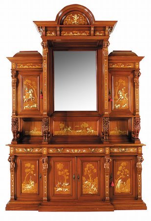 SoldA RENAISSANCE REVIVAL BURL BLACK WALNUT MIRRORED MARBLEA RENAISSANCE REVIVAL BURL BLACK WALNUT MIRRORED MARBLE TOP CREDENZA, PROBABLY ENGLAND, LAST QUARTER 19TH CENTURY, in the Renaissance Revival taste, the shaped breakfront highly figured white marble oSee Sold Price