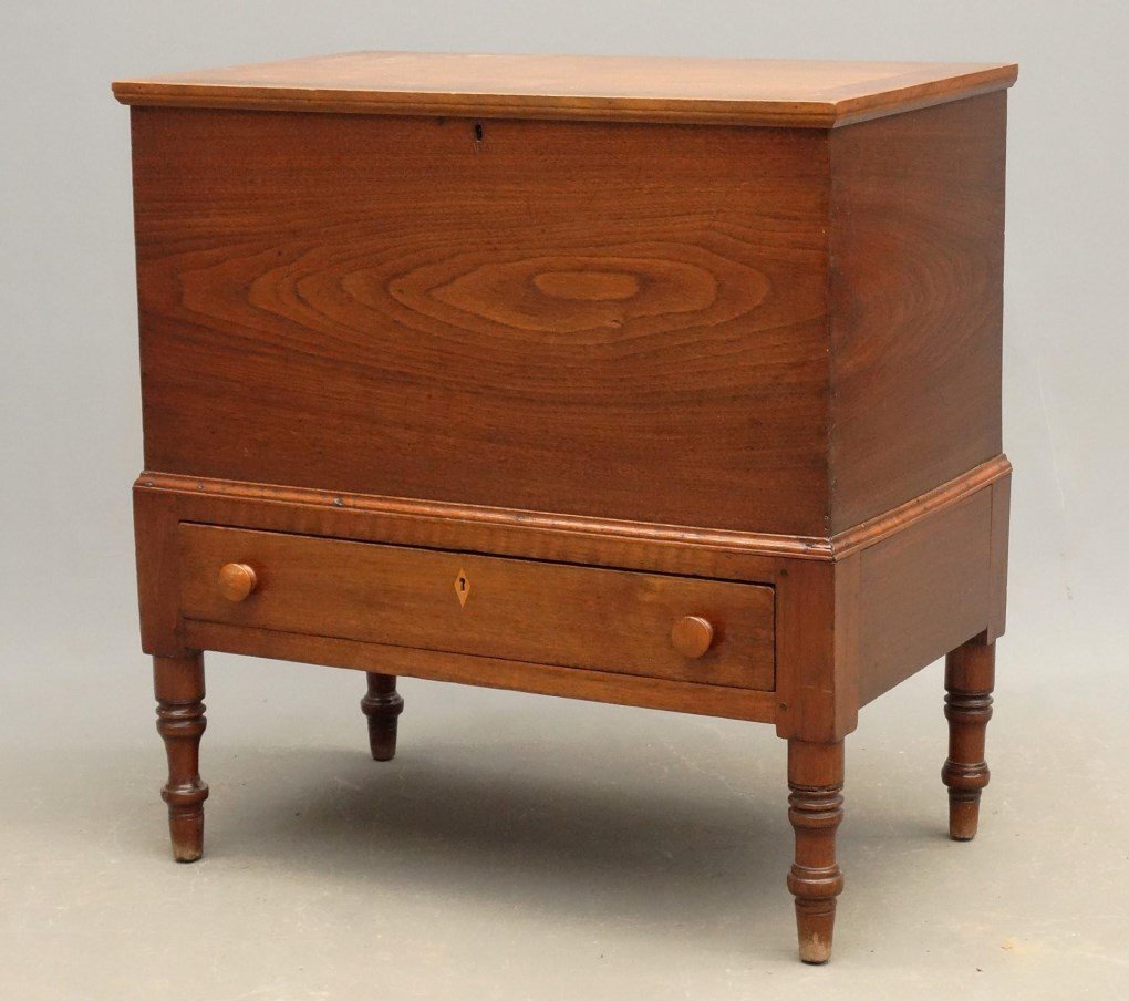 American Southern Walnut Sugar Chest, probably Kentucky or Tennessee, early 19th c., H.- 27 1/2 in.,American Southern Walnut Sugar Chest, probably Kentucky or Tennessee, early 19th c., the hinged top over dovetailed inset case with lock, the base with moulded surround, single drawer, tapered legs, H