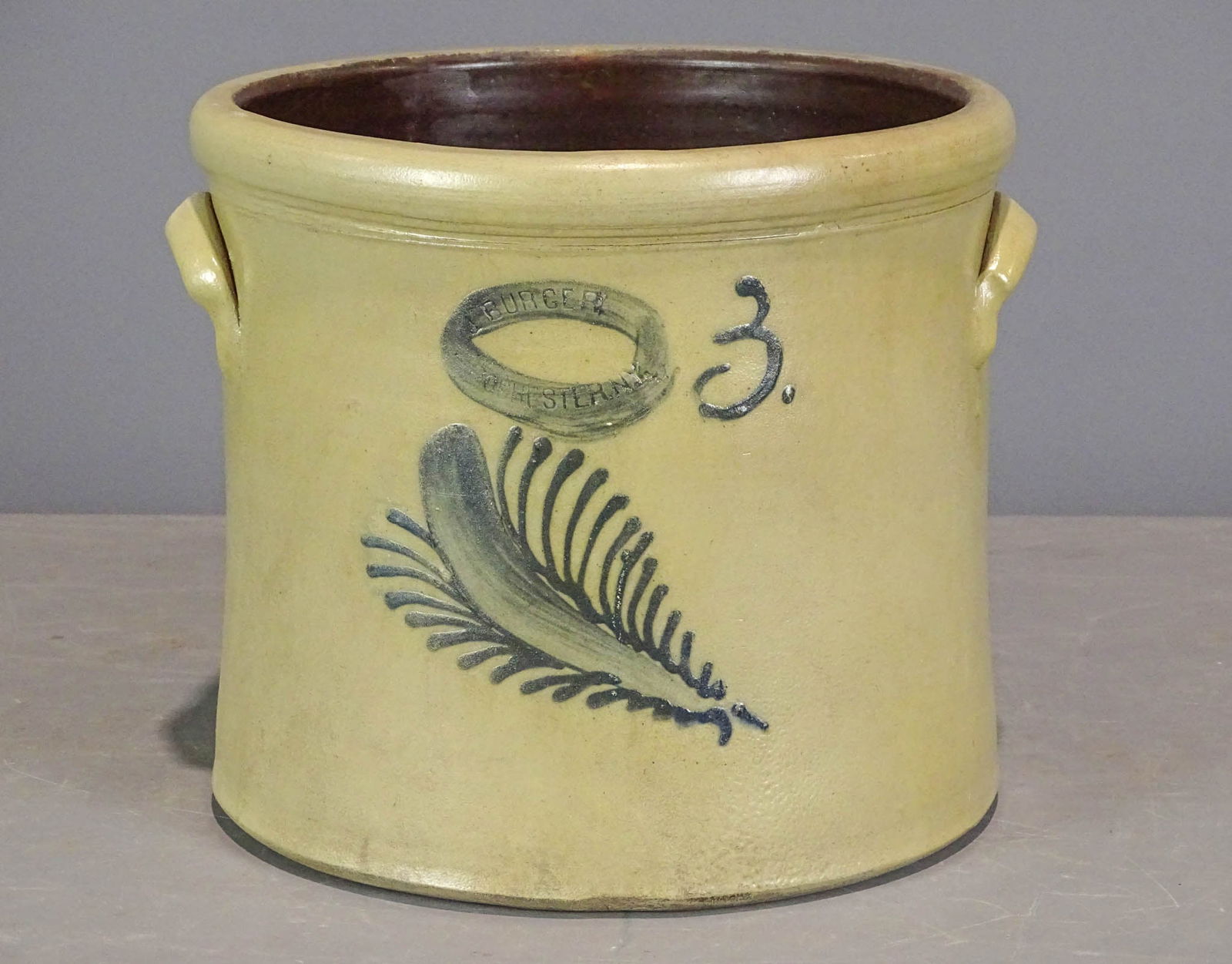 Sold19th c. Stoneware Decorated Crock19th c. stoneware decorated crock. J. Burger, Rochester N.Y.. 10 1/2" D., 10" Ht..See Sold Price