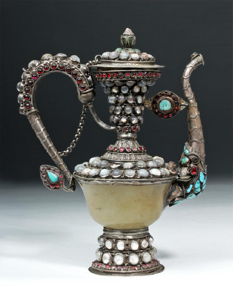 19th C. Tibet Silver, Moonstone, & Gemstone Pitcher