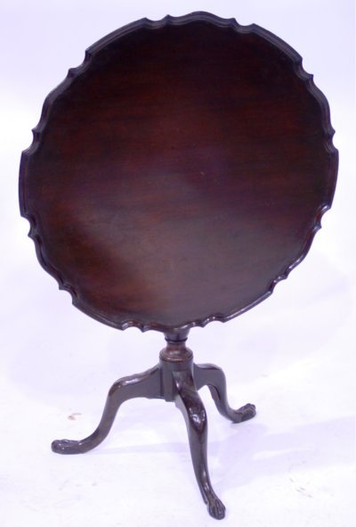 SoldChippendale Mahogany Tilt Top TableChippendale mahogany tilt top table, circular top w/pie crust molded trim, base w/bird cage and turned pedestal, snake legs with carved knees and ball and claw feet, circa mid 19th c., 28" (h) x 36" xSee Sold Price