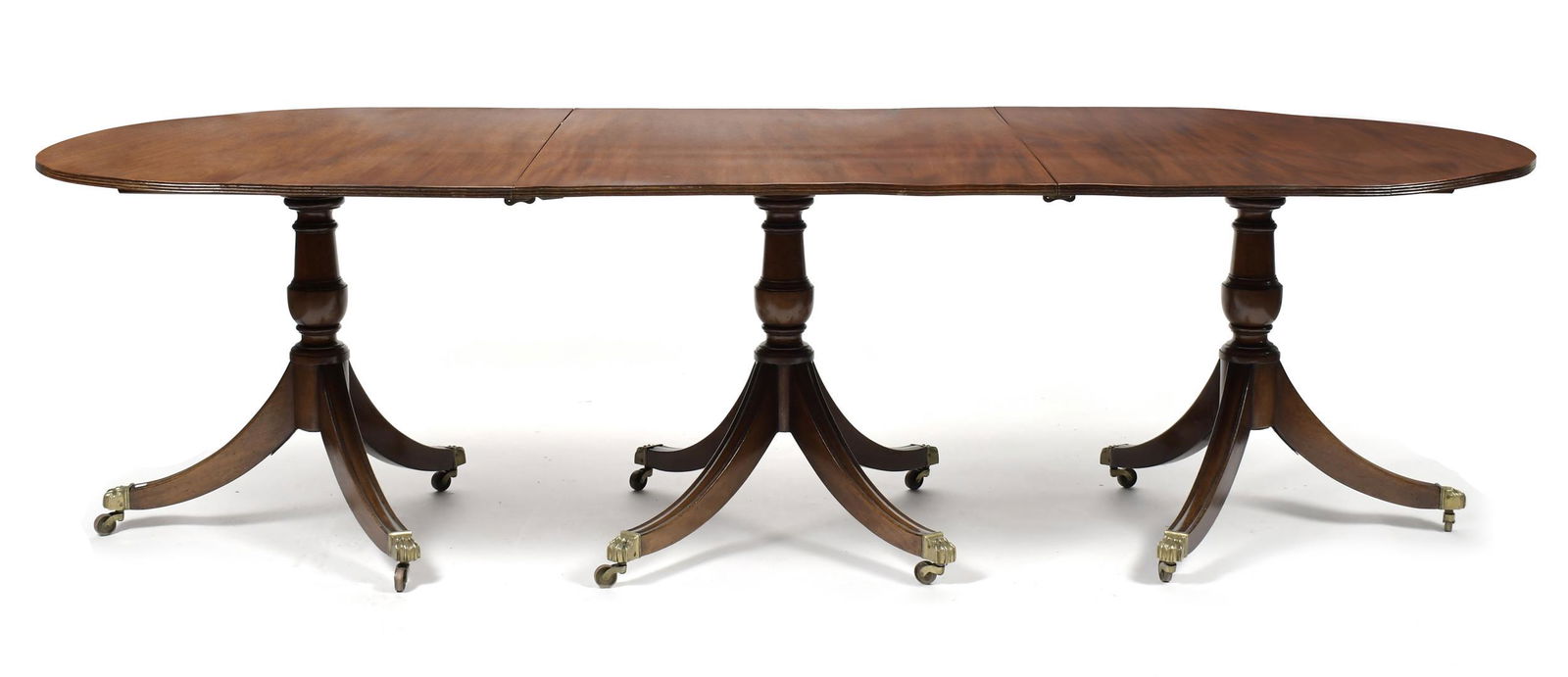 19TH C. TRIPLE PEDESTAL MAHOGANY DINING TABLE.