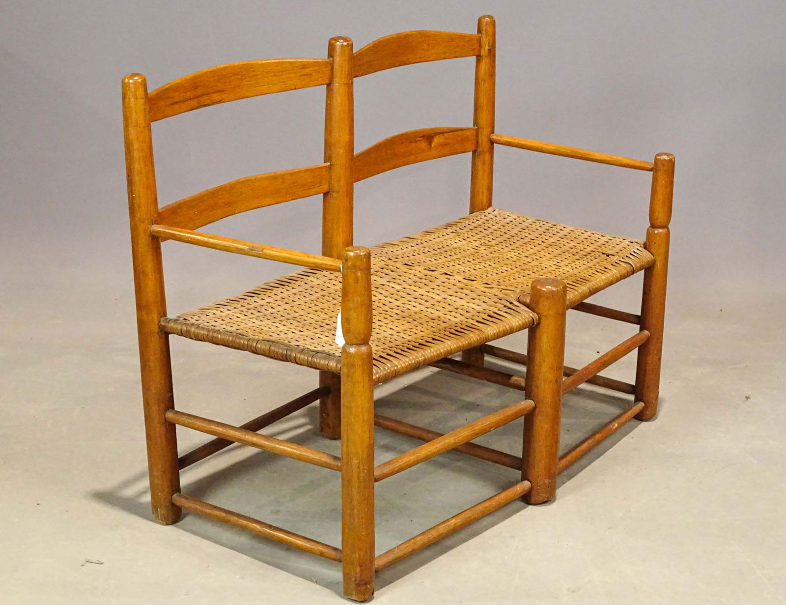 SoldEarly Ladder Back Wagon SeatMid 19th C, Maple frame, split oak seat, Oak back, shaker form, 30 tall to back 15.5 to seat x 37 wide x 17 deepSee Sold Price