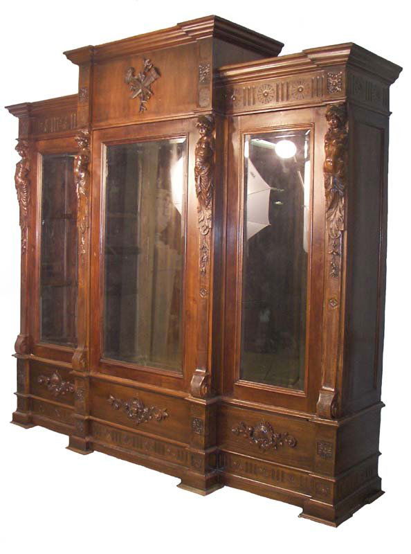 19th C. walnut triple door figural bookcase