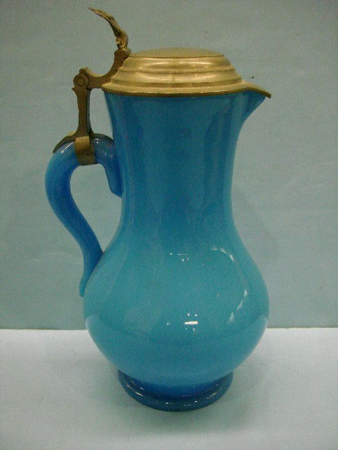 SoldTwo Glass TankardsTwo blue glass tankards with pewter lids. 19th century. Larger tankard H 8-1/2" D (w/o handle) 3-5/8". Smaller tankard H 7" D (w/o handle) 4-3/4". Condition: Excellent with minor imperfections. Link fSee Sold Price