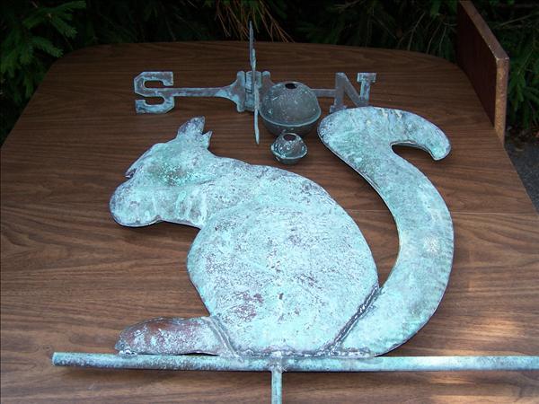 SoldLate 19th C. Large Copper Rearing Horse WeathervaneLarge Copper rearing horse weathervane, late 19th c., the horse silhouette within a banner, having a rosette collar on finial, retaining an old verdigris surface and original directional, 92.5" h., 64See Sold Price