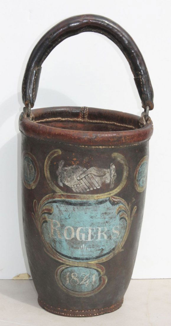 19thC Eastern MA leather fire bucket w polychrome paint