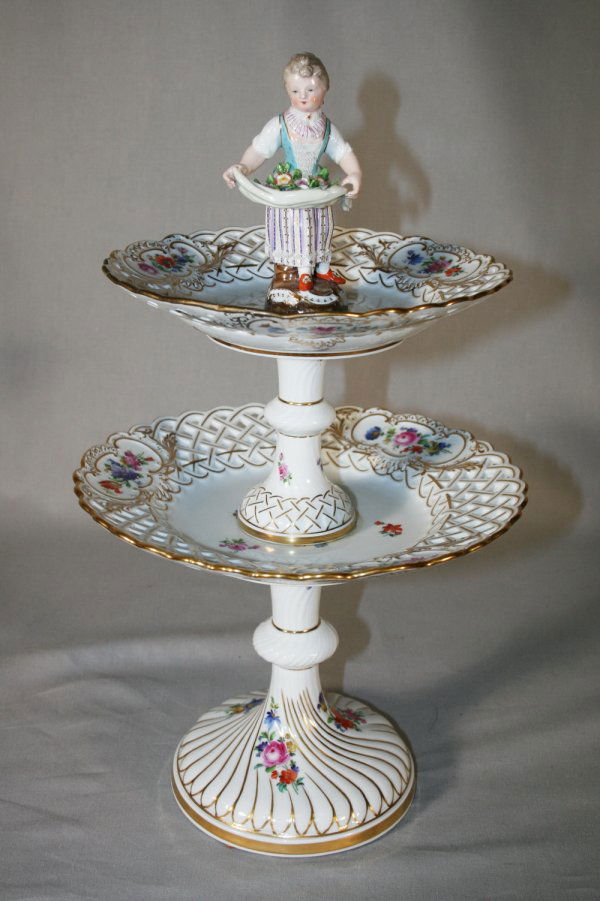 SoldMeissen Germany Two-Tier CenterpieceMeissen Germany two-tier centerpiece, having a figure of a boy holding a wreath as a finial. [Approx. 20 inches high]. Appears to have been restored (see images base).See Sold Price