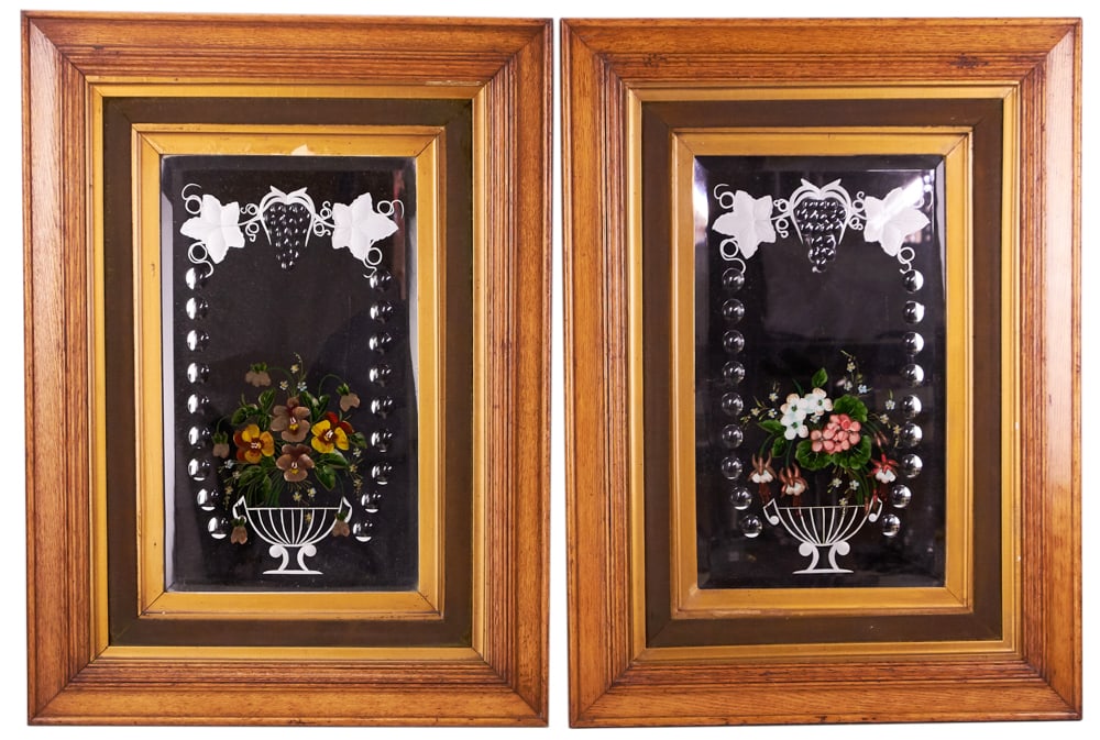 19thC Victorian Cut Mirrored Reverse Painted Panels