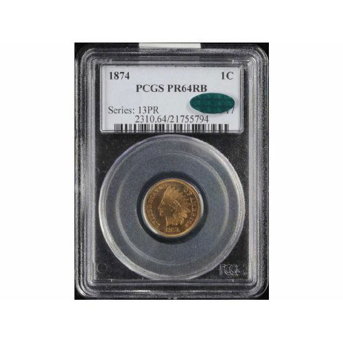 Sold1874 Indian Head Cent1874. Snow-8. PCGS graded MS-65 Red & Brown. CAC. Eagle Eye Photo Seal. Off-center clash marks from the denticles of another die on the neck below the ear. About 75% red. Full strike. In a PCGS FirstSee Sold Price