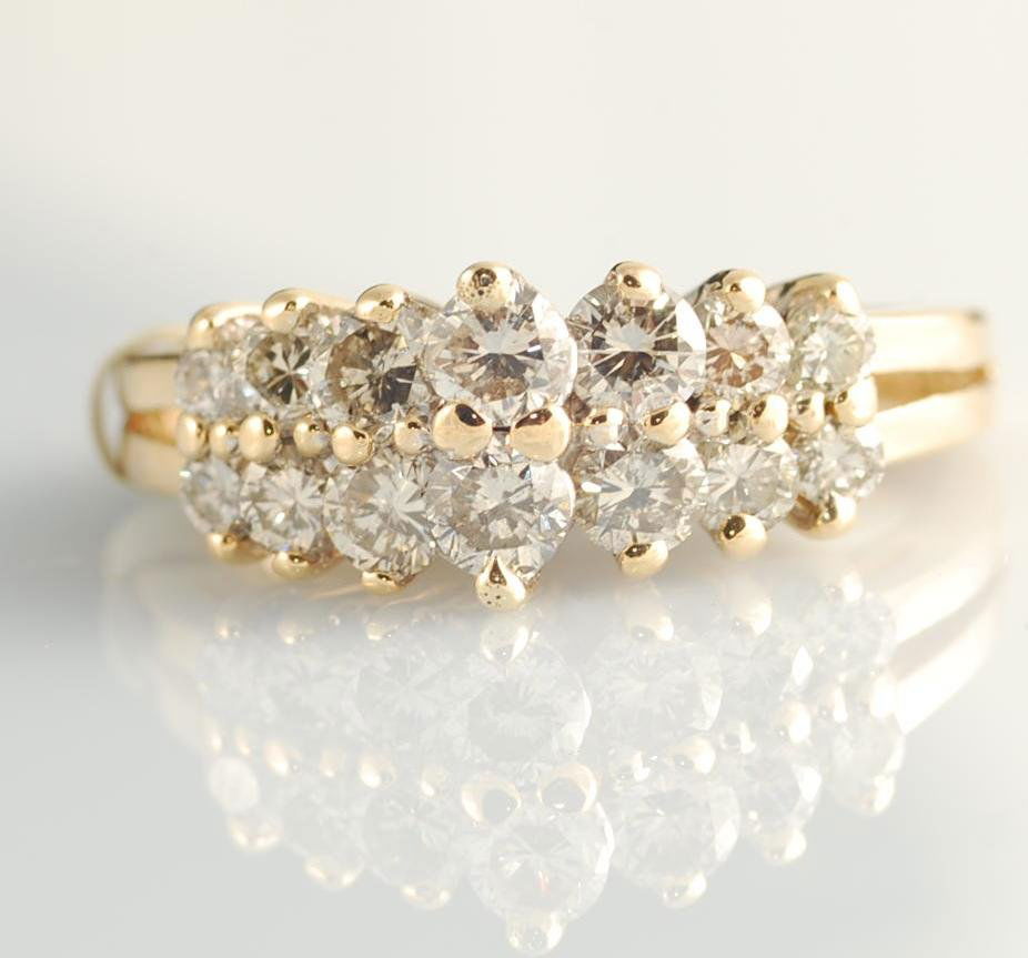 SoldVintage 14K Yellow Gold 1ct Diamond RingThis is a vintage 14K gold ring. Rendered in fine 14K gold, the ring is set with ten full cut diamonds totaling an estimated 1tcw. The diamonds are SI clarity and HI color. From the estate of Mrs. ChaSee Sold Price
