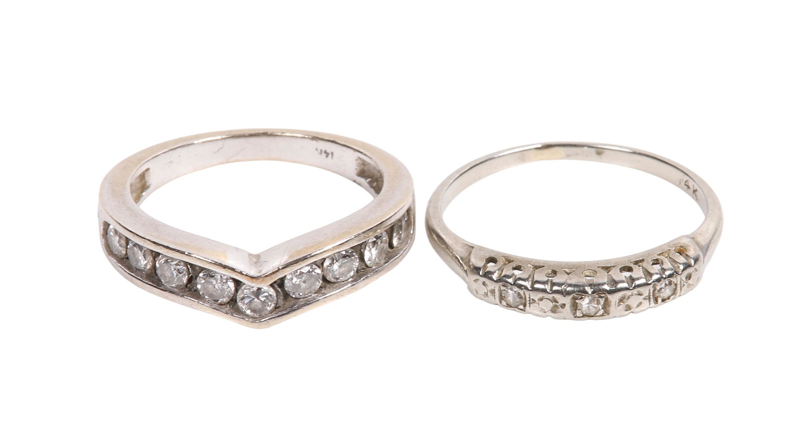 Sold2 14K Gold Bands incl DiamondMarked 14k white gold bands including 10-stone channel set diamonds each approximately .02 carat. Both size 8. 3.8 grams total. EKSee Sold Price
