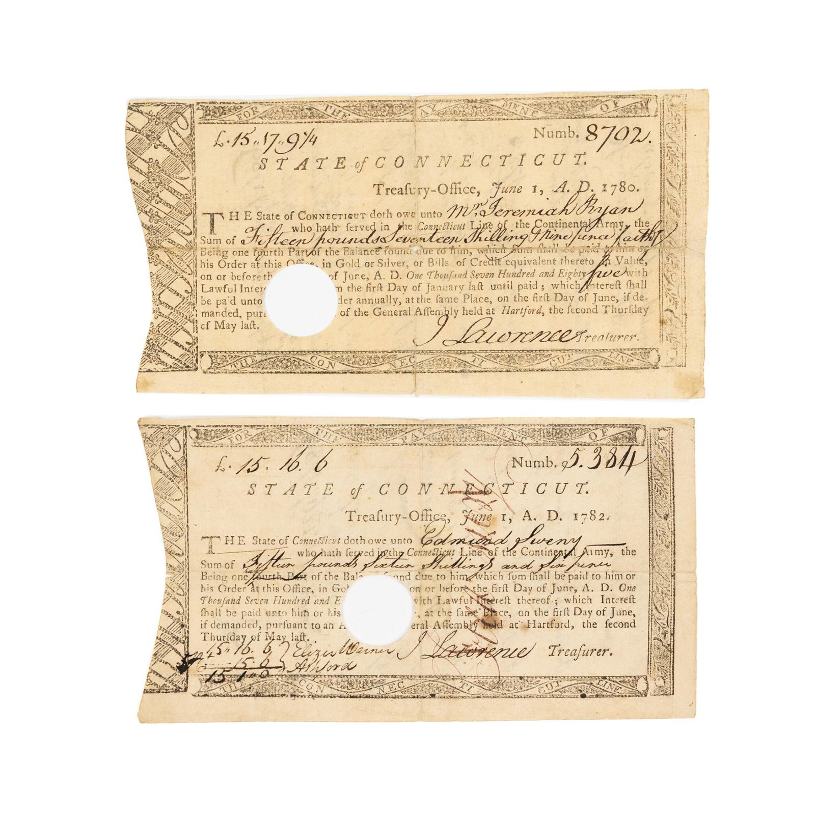 (2) 18th C Connecticut State Treasury Slips