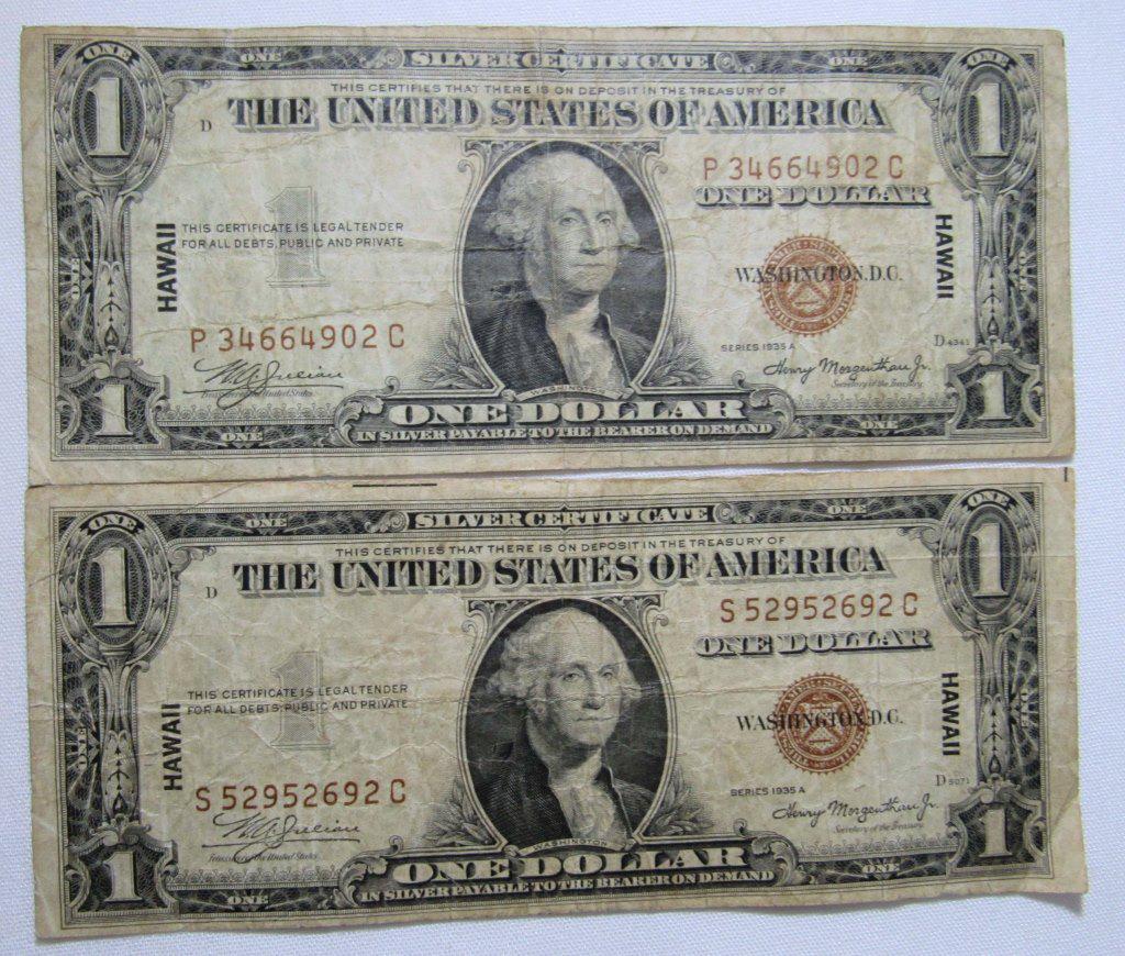 (2) 1935 $1 "HAWAII" SILVER CERTIFICATES