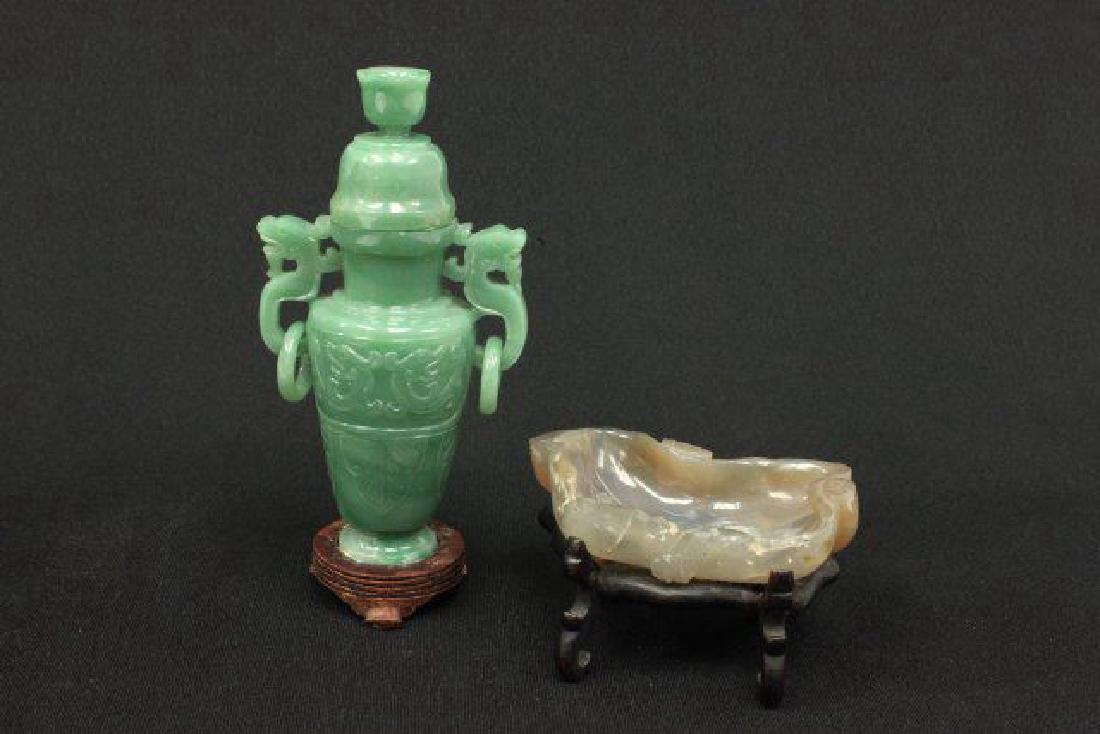 SoldAssorted Grouping of Carved Asian Items.Includes a carved dragon form belt hook; (2) carved pheasants on fitted wood stands; a carved bamboo and agate form vase accompanied by a carved ruyi cloud agate base; a carved dragon and foo dog liddSee Sold Price
