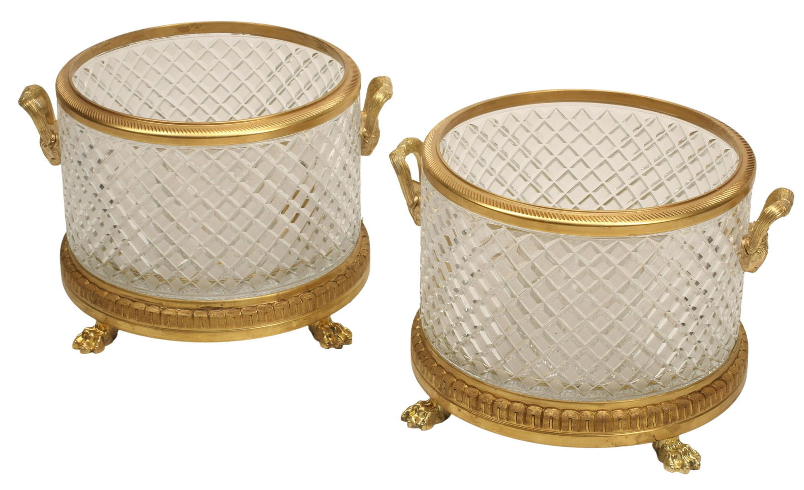 Sold(2) BACCARAT STYLE ORMOLU-MOUNTED CUT CRYSTAL PLANTERS(pair) Baccarat style cut crystal planters, with bronze dore mounts, rising on paw feet, approx 11"h, 16"w, 14"d, 52.5lbs totalSee Sold Price