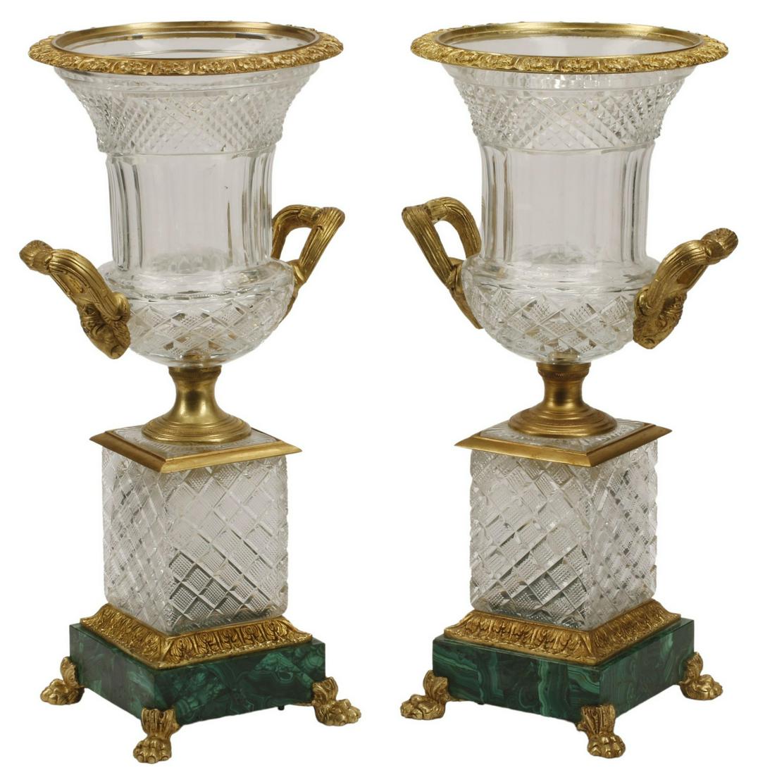 SoldEmpire-Style Cut Crystal UrnsPair of Empire-Style Bronze and Malachite-Mounted Cut Crystal Urns , 20th c., loop handles with portrait busts , h. 20 1/2 in., w. 11 in., d. 9 inSee Sold Price
