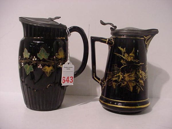 2 Black Glazed Redware Lidded Syrup Pitchers