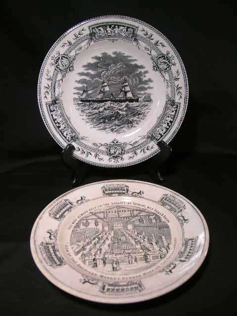 2 BLACK TRANSFERWARE PLATES BUILDING SAIL BOAT