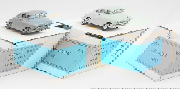 Sold2 CCC VEHICLESresin, F99 1958 Simca Presidence, black, #102 1956 Bugatti 252, blue, both mounted on plastic plinths, orig boxes & inserts, C9.See Sold Price