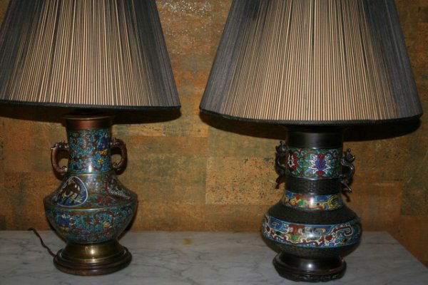 2 CHAMPLEVE TABLE LAMPS: 1-W/DRAGON SIDE HANDLES