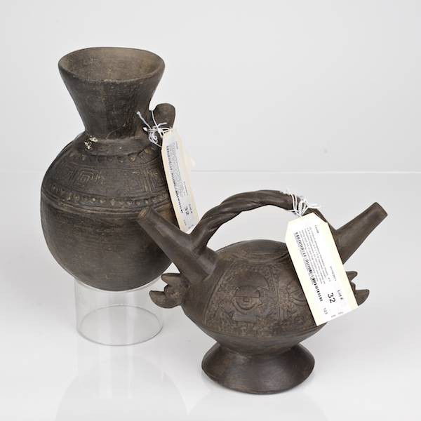 SoldLot of 2 Ancient Pre Columbian Chimu Blackware Pottery Vessels Ca. 1100-1500 A.D.Lot of 2 Ancient Pre Columbian Chimu Blackware Pottery Vessels Ca. 1100-1500 A.D. Size 6 1/4 - 7 1/2 inches high. Provenance: Ex Dr Arnold R.Saslow South Orange NJSee Sold Price